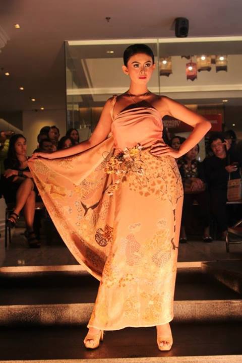 Kemudian warna tersebut dituangkan ke dalam kain sutera dengan teknik eksperimen celup, coletan, dan lainnya. “Karya ini diperuntukkan dalam busana gaun malam. Untuk motifnya, saya desain dari proses malam juga, seperti dalam pembatikan. Dengan warna alam yang tentu berbeda dengan warna sintesis,” ucapnya.