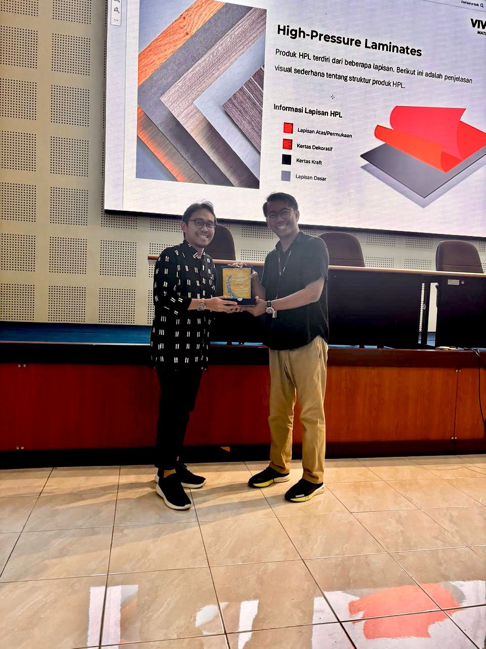Dalam kegiatan ini, mahasiswa mendapat kesempatan untuk mendesain dan membuat simulasi pengaplikasian HPL CARTA pada panel interior. Mereka bekerja mulai dari tahap konsep, pemilihan motif dan tekstur, hingga proses aplikasi HPL pada permukaan panel. Seluruh proses didampingi oleh Bapak Oky Rahmadhani dan tim teknis CARTA, yang memberikan panduan terkait karakter material, teknik pemotongan, aplikasi lem, metode pressing, hingga finishing yang tepat.
